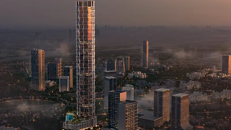 - Tallest tower in JVC with 60+ storeys, podium, rooftop, and iconic façade design.